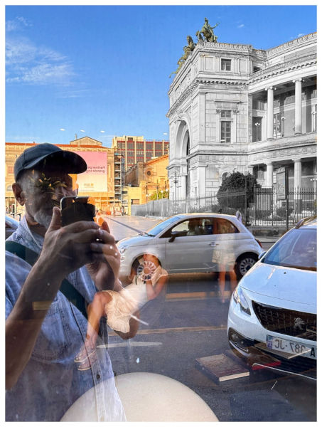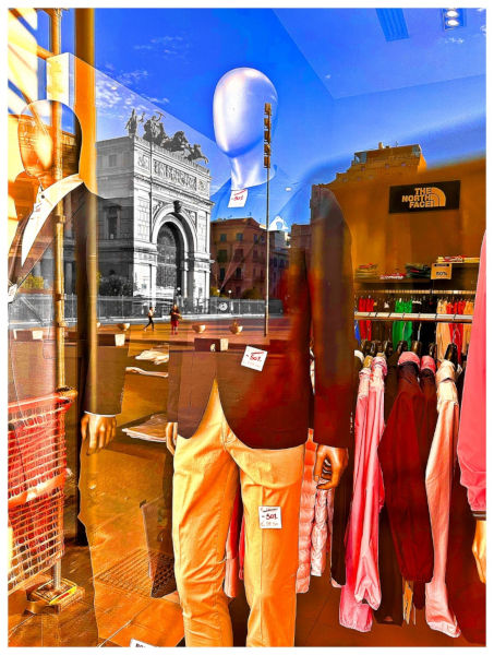 Gli scatti dei monumenti riflessi sulle vetrine rappresentano invece un modo per focalizzare l’attenzione su un altro punto di vista, che non è solo quello che si evince dalla nostra immagine mentre ci specchiamo ma che viene fuori anche da tutto ciò che ci circonda e ci identifica all’interno di un contesto storico.  I monumenti riflessi, infatti, rappresentano e raccontano la storia della nostra città, esistono da prima che venissimo al mondo e continueranno a esistere anche dopo di noi».