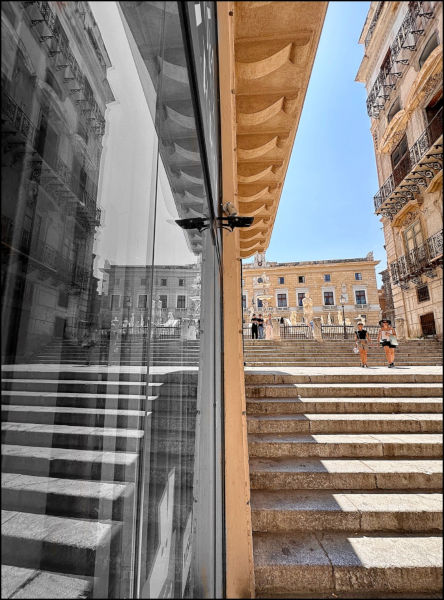 Attraverso immagini riflesse nelle vetrine l’autore documenta la storia della nostra città, tra monumenti ed esistenze che si stratificano. Un racconto per immagini che si lega a un incontro intorno al significato di memoria, riscatto e legalità.