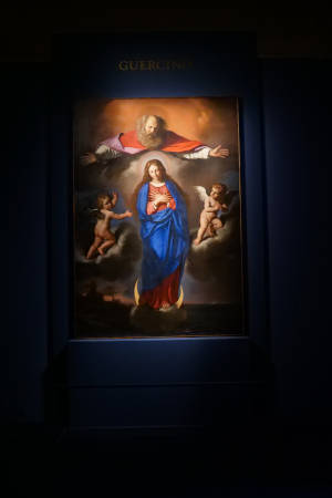 Facente parte di un’importante donazione che Luigi Rocchi Camerata fece al Comune di Ancona nel 1906, l’opera del Guercino si presenta nella sua bellezza al di fuori del tempo, molto alleggerita dei simboli che ne hanno caratterizzato l’iconografia tridentina, dei quali resta la mezzaluna calpestata sul nimbo. Si tratta di un’immagine realistica e al contempo simbolica, che si inscrive in un momento storico che ha superato le indicazioni della Controriforma e che risponde a necessità prettamente devozionali. Conforme alla tradizione classica è invece la figura del Creatore, calvo, barbuto, illuminato da sinistra, perfettamente tratta dall’Apocalisse di Giovanni. La falce di luna sotto i piedi della Vergine ne rinsalda la flessuosa postura, sottolineata dal capo reclinato verso destra, quasi a descrivere una curva che nell’insieme sottrae la composizione alla staticità del santino devozionale. Alla luce netta dei soggetti rappresentati si contrappone la luce modulata sul paesaggio, invenzione felicissima che è anche un omaggio alla città di Ancona attraverso la raffigurazione del mare. In questo dipinto torna il leitmotiv della torre, elemento architettonico ricorrente nel fraseggio dell’artista, che forse è un retaggio, una memoria del proprio vissuto.