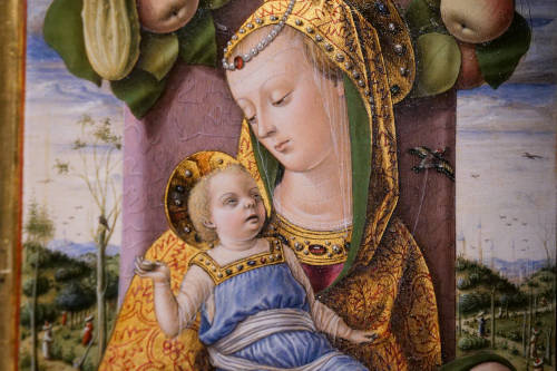 La Madonna col Bambino è un piccolo gioiello dell’arte prodotto da Carlo Crivelli nel corso di una lunga permanenza in terra marchigiana, dopo aver lasciato la città d’origine, Venezia, e Zara.