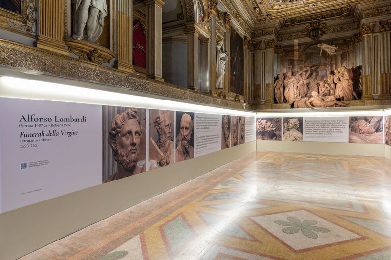 Il percorso museale parte dal Santuario, celebre per il “Urlo di pietra” del Compianto sul Cristo morto di Niccolò dell’Arca, e si sviluppa fino all’Oratorio, dove si possono ammirare capolavori come il Transito della Vergine di Alfonso Lombardi. Questo gruppo scultoreo in terracotta, risalente alla prima metà del XVI secolo, è ora protagonista di un nuovo allestimento grafico, con un percorso espositivo che permette ai visitatori di immergersi nei dettagli espressivi delle opere e nei loro intensi giochi di sguardi. Frasi tratte da fonti storiche arricchiscono l’esperienza, offrendo una prospettiva sul successo di queste sculture nel corso dei secoli.
