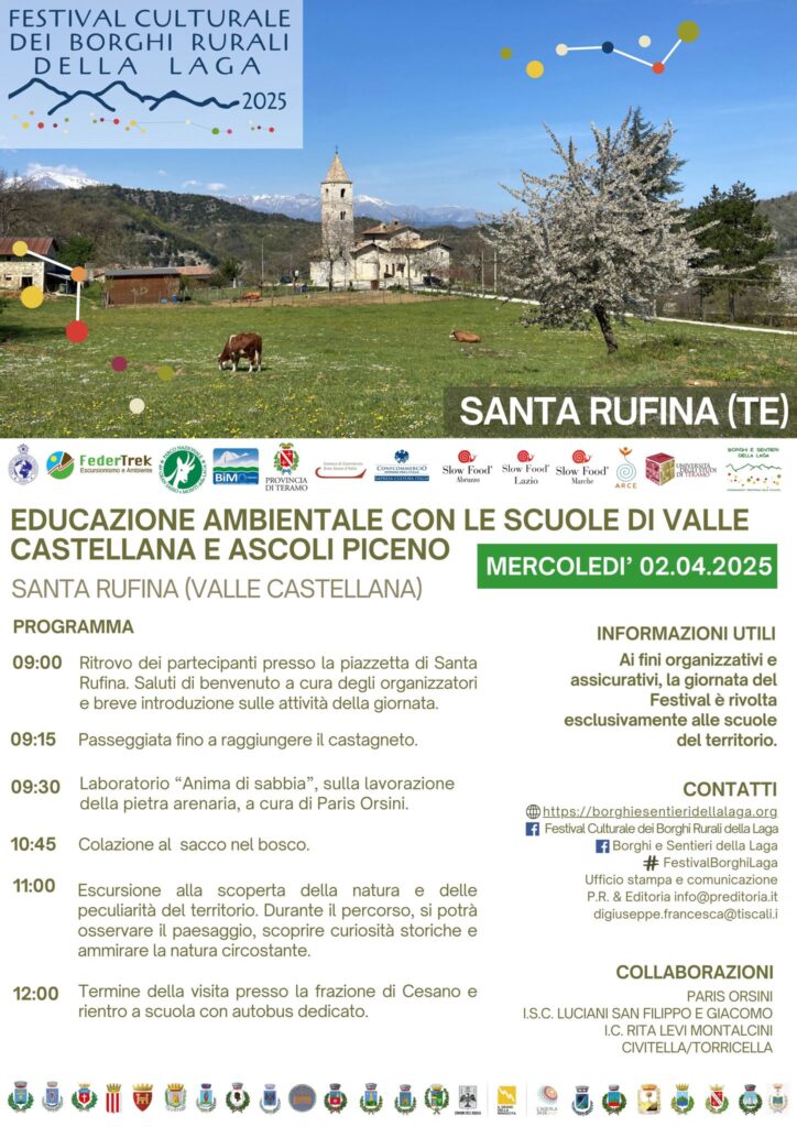TERAMO – Il 2 aprile 2025, nell’ambito del Festival Culturale dei Borghi Rurali della Laga 2025, si terrà a Santa Rufina (Valle Castellana, TE) una mattinata interamente dedicata all’educazione ambientale, riservata alle scuole di Valle Castellana e Ascoli Piceno: I.S.C. San Filippo e Giacomo e I.C. Rita Levi Montalcini Civitella/Torricella.