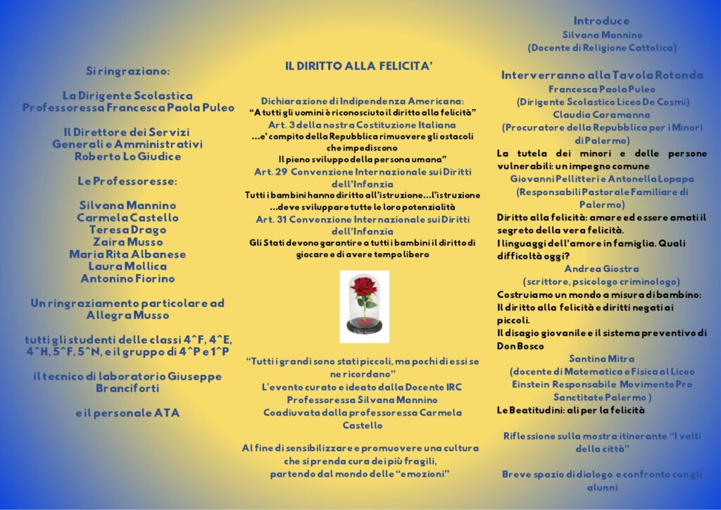 PALERMO – Giovedì 3 aprile, con inizio alle ore 10:30 e conclusione alle ore 13:00, si terrà una Tavola Rotonda presso l’Aula Magna della sede di via Leonardo Ruggeri 15 del Liceo G. A. De Cosmi sul tema dei diritti umani, dell’infanzia e dell’adolescenza.