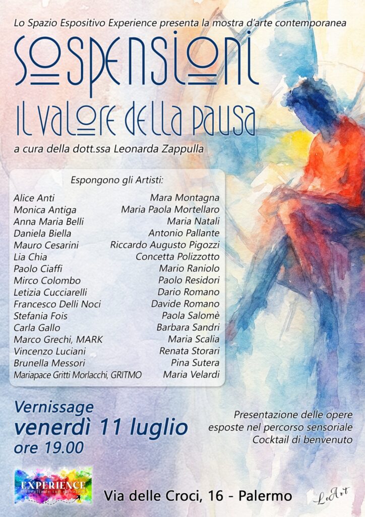 Una valorizzazione del valore della sospensione. Tra creatività e meditazione. Tutto questo e tanto altro è “Sospensioni-Il valore della pausa”, collettiva a cura di Leonarda Zappulla in programma nei locali dello spazio espositivo “Experience”, in via delle Croci 16 a Palermo.