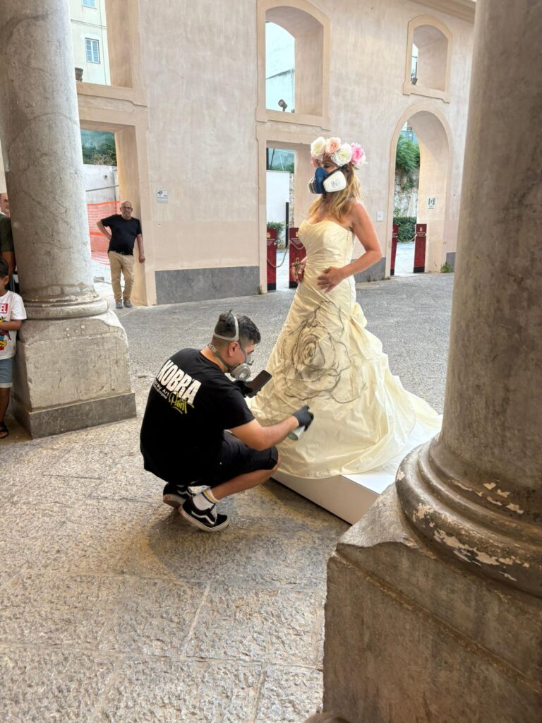 PALERMO – Un’iniziativa solidale per dare spazio e voce alla speranza e alla bellezza nel quartiere Sperone di Palermo. Un abito da sposa indossato da una “Rosalia ribelle” è stato dipinto dal vivo dall’artista Giulio Rosk nell’ambito del progetto “Abiti RiBelli” nell’atrio del Museo Regionale d’Arte Moderna e Contemporanea “RISO” di Palermo.