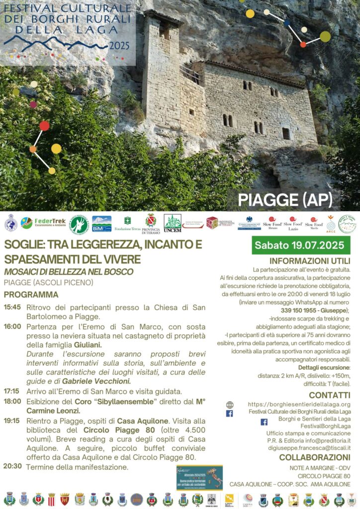 Il programma prevede un’escursione guidata all’Eremo di San Marco, con partenza da Piagge (Chiesa di San Bartolomeo), una sosta presso la storica neviera della famiglia Giuliani e l’esibizione del coro Sibyllaensemble, diretto dal M° Carmine Leonzi.