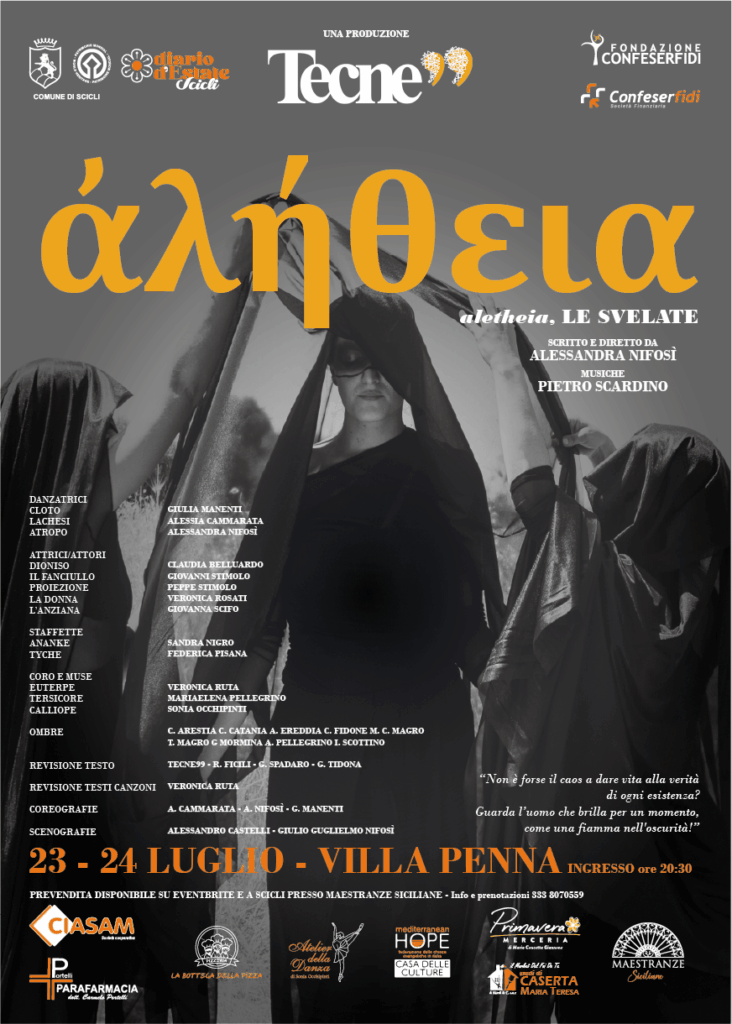 SCICLI- Evento di musica, danza, recitazione e cultura in Diario d’Estate 2025, con il patrocinio del Comune di Scicli e il sostegno di Confeserfidi e Fondazione Confeserfidi. In scena nella suggestione di Villa Penna, “ἀλήθεια – Le Svelate”, una produzione di Tecne99 in collaborazione con diverse realtà della città. Spettacolo che unisce teatro, danza e musica in un percorso itinerante tra mito e verità, tra luce e ombra, è scritto e diretto da Alessandra Nifosì, con le musiche di Pietro Scardino. Due gli appuntamenti: mercoledì 23 e giovedì 24 luglio 2025, con ingresso alle 20:30 e inizio spettacolo alle 21:00. Il pubblico verrà guidato attraverso le figure del mito – Cloto, Lachesi, Atropo, ma anche Dioniso, l’Anziana, la Donna, il Fanciullo e altri archetipi – che prendono vita in un intreccio corale e simbolico.