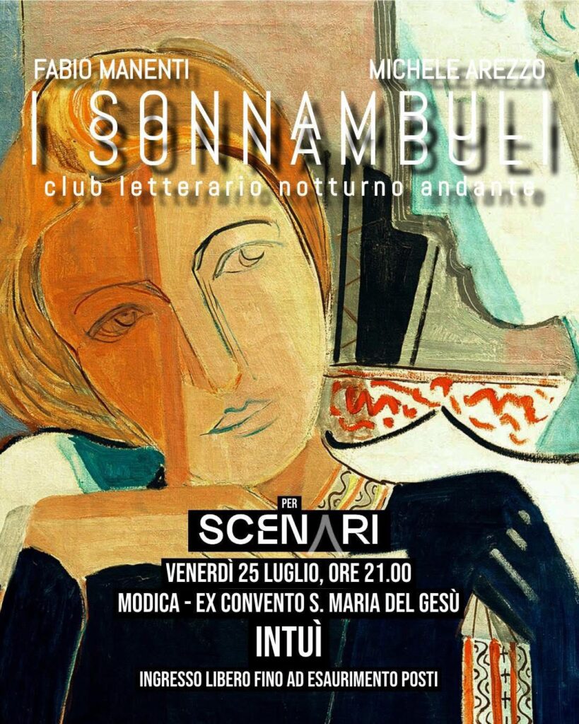 Stefano Giaquinta, CEO di Mutika EMC, il Presenting Sponsor di Scenari condivide il pensiero generale: “Siamo davvero contenti di come sta andando la rassegna, delle risposte della gente, delle presenze, del consenso, del nostro pubblico. E guardiamo avanti convinti di avere un sentiero intessuto che può solo produrre benefici alla nostra Città e al nostro territorio. Percorrere insieme questo sentiero significa realizzare concretamente il concetto di team building. Condividere questi momenti, significa spargere il seme migliore della cultura e della nostra storia, nei luoghi dove siamo nati e cresciuti”. Messi in archivio questi altri tre momenti, c’è una grande settimana che ci aspetta e che comincia già oggi con gli autori e i loro libri mentre venerdì 25 luglio, alle 21, protagonisti nella suggestiva ed unica cornice del Chiostro di Santa Maria del Gesù a Modica alta, sono I Sonnambuli: Fabio Manenti e Michele Arezzo. Evento ad ingresso libero, sino ad esaurimento posti, dall’esplicativo titolo ‘Intuì’ per vivere nella loro classica atmosfera, un momento di coinvolgimento e forza emotiva come solo i racconti, le storie e le narrazioni del duo ragusano, sanno trasmettere.