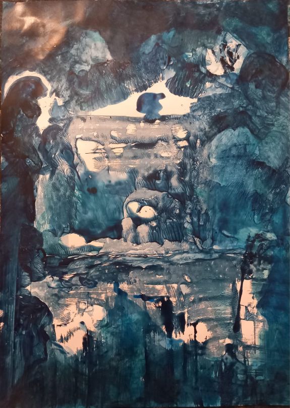 Affiorano fantasticamente volti ma anche prospettive ardite, interni, esterni, visioni infernali, gabbie, tutte ricche di un simbolismo che non è dato comprendere a prima vista. Colpiscono oltremodo le particolari ed intense sfumature del blu che evocano profondamente una visione ultraterrena in cui prevalgono delle visioni oniriche indescrivibili. Più prettamente simbolista appare la tormentata marina dove sottili lingue di fuoco (che altro non sono che il riflesso di un sole infuocato visibile in alto) accendono il mare che è in apparenza molto placido.