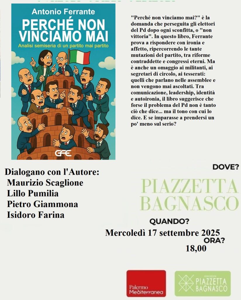 PALERMO – Come capire perché il Pd perde le tornate elettorali che dovrebbero invece vederlo uscire vittorioso. “Perché non vinciamo mai?” il libro di Antonio Ferrante che sarà presentato mercoledì 17 settembre in piazzetta Bagnasco