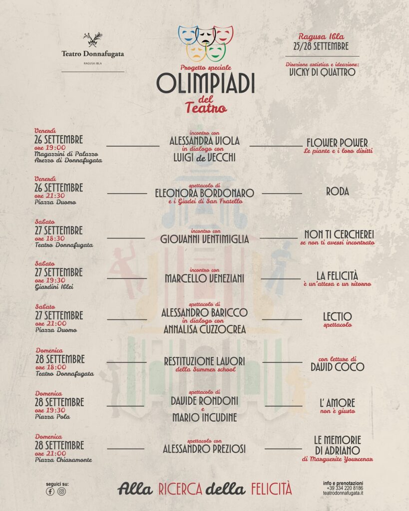 Le “Olimpiadi del Teatro – alla ricerca della felicità” hanno il supporto del Ministero della Cultura, dell’Assessorato dei Beni culturali e dell’Identità siciliana, del Comune di Ragusa, del Libero Consorzio Comunale di Ragusa, della Camera di Commercio del Sud Est Sicilia, di Confagricoltura Ragusa, della Banca Agricola Popolare di Sicilia, in collaborazione con Fondazione Sylva, Itaca Scuola di scritture e AOG Trekking. Gold sponsor sono Eni (che per la prima volta abbraccia un grande progetto culturale del Teatro Donnafugata a Ragusa), Gruppo Cappadona, Range Rover di Sergio Tumino, Regran. Silver sponsor sono Argo Software, Cappello e Battaglia Group – Reale Mutua agenzia di Ragusa, Engel & Völkers Ragusa-Modica, Bigbag, Marina Iblea, Rosso di Sicilia, Sigla, Valle dell’Acate, Polara. Tutti gli incontri sono a ingresso gratuito, ad eccezione dello spettacolo di Alessandro Preziosi. Prenotazioni obbligatorie per tutti gli appuntamenti sul sito www.teatrodonnafugata.it. Informazioni anche sui canali social.