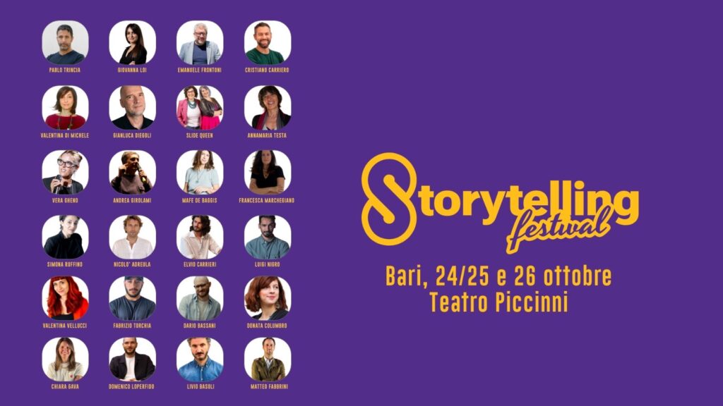 BARI – Storytelling Festival, l’evento che riunisce centinaia di aziende, manager, professionisti e studenti ispirando e creando opportunità di networking, torna a Bari per l’ultimo weekend di ottobre. Sul palco dello storico teatro Piccinni, il 24 e 25 ottobre le storie diventeranno leve di riflessione e trasformazione, capaci di attraversare business e società attraverso un programma ricco di incontri, talk e workshop che vedranno alternarsi massimi esperti della comunicazione a grandi protagonisti della nostra cultura. Tra gli ospiti attesi per questa edizione, ci saranno: Annamaria Testa, Pablo Trincia, Martina Marchiò, Gianluca Diegoli, Elvio Carrieri, Andrea Girolami, Vittorio Pettinato, Emanuele Frontoni, Giovanna Loi, Donata Columbro, Mafe De Baggis, Simona Ruffino e Valentina Vellucci. A chiudere il Festival, una grande novità, lo Storytelling Extra, spin off ad accesso gratuito previsto per il 26 ottobre con la sociolinguista Vera Gheno.