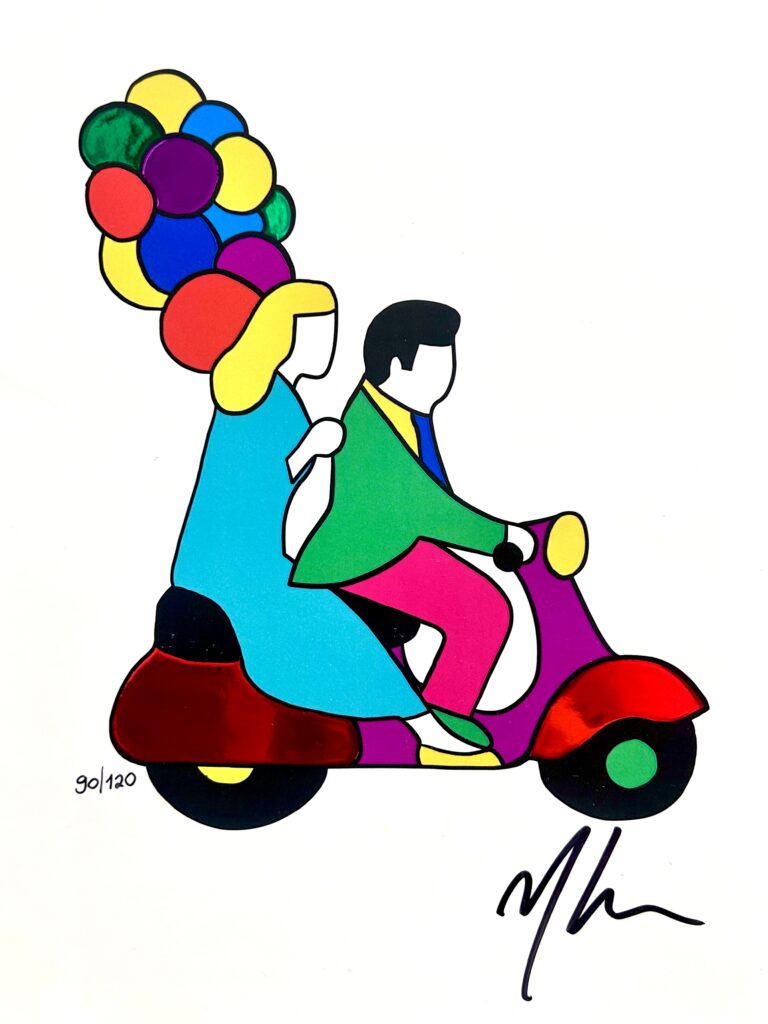 Nello specifico, le sue serigrafie su carta e PCV sono immediatamente riconoscibili per il linguaggio pop, ironico ed elegante, che trae ispirazione da icone della cultura contemporanea.