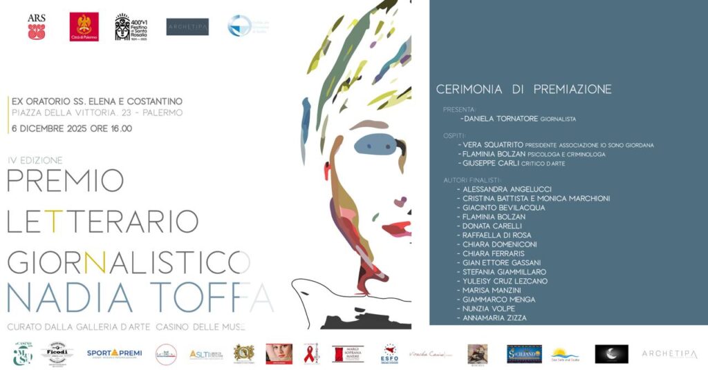 PALERMO- La Giuria del Premio Letterario Giornalistico “Nadia Toffa”, ideato dall’associazione Archètipa di Antonietta Greco e giunto quest’anno alla quarta edizione, annuncia ufficialmente le opere finaliste dell’edizione 2025, selezionate per il loro valore narrativo, l’impegno civile e la capacità di interpretare lo spirito del premio dedicato alla nota giornalista e conduttrice. Anche quest’anno il Premio conferma la propria missione: dare voce a storie che esplorano verità scomode, testimonianze, coraggio personale e sociale, con uno sguardo attento alle fragilità e alla forza dell’essere umano. Attenzione al mondo dell’arte e della cultura grazie alla curatela della cerimonia di premiazione quest’anno affidata alla galleria d’arte Il Casino delle Muse di Palermo del critico d’arte Giuseppe Carli.