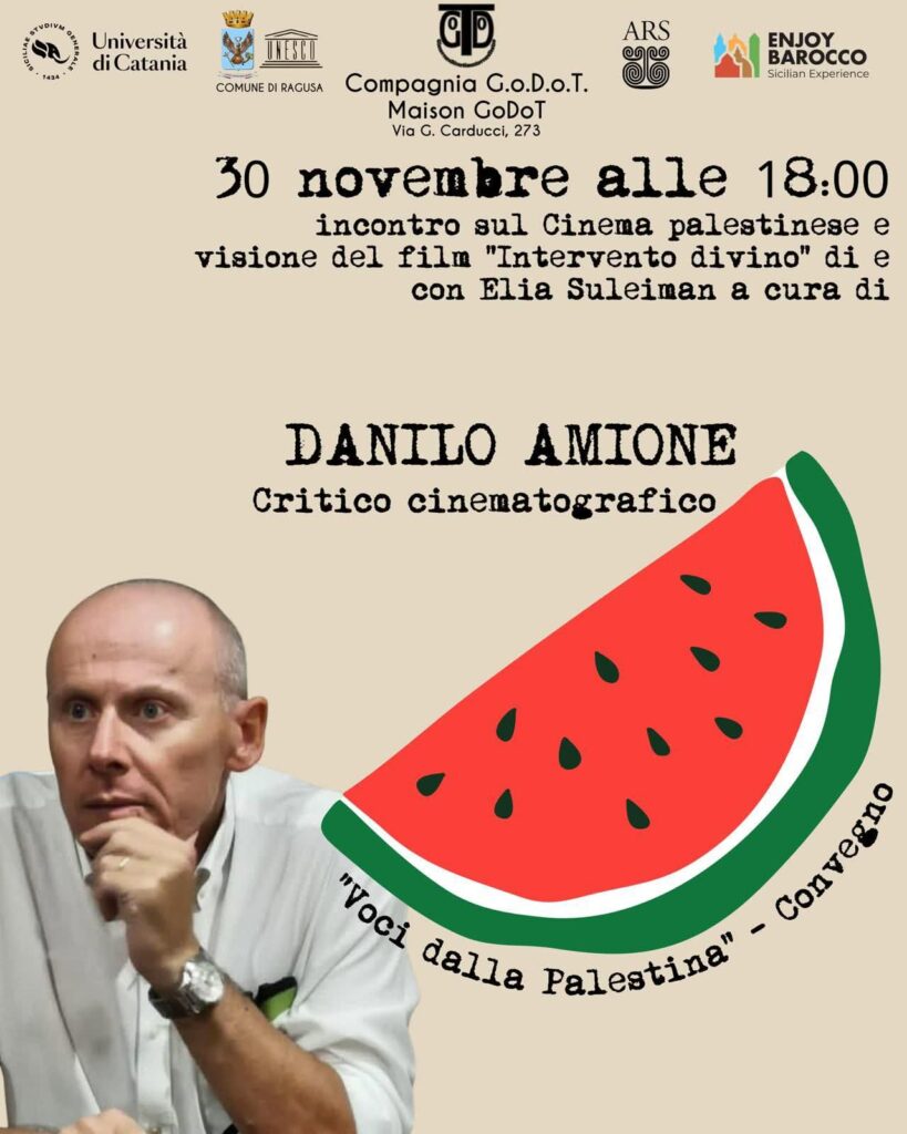 Sabato alle 19.30 con le professoresse di letteratura araba, Alba Rosa Suriano e Daniela Potenza, il tema del popolo palestinese , che continua a essere oggetto di stragi e di violenza, è stato affrontato dal punto di vista letterario e poetico attraverso delle letture scelte, mentre domenica alle 18, dopo una sapiente introduzione del critico Danilo Amione, accolto sul palcodai padroni di casa Federica Bisegna e Vittorio Bonaccorso, si è dato spazio alla visione del film INTERVENTO DIVINO del regista palestinese Elia Suleiman, realizzato nel 2002.