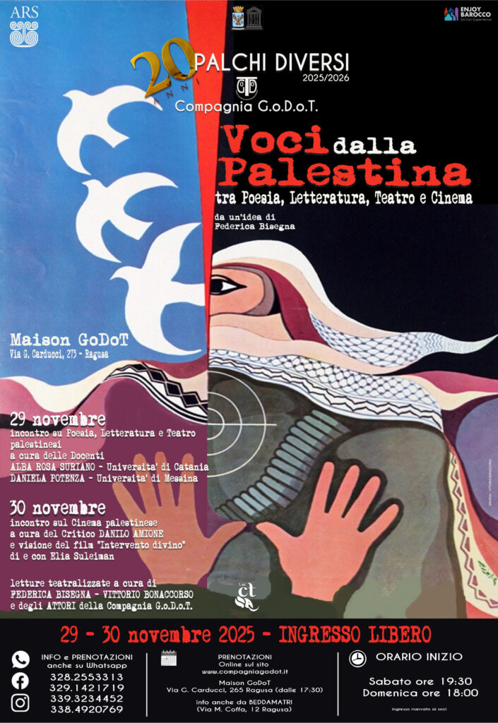 Giorno 29 e 30 novembre 2025 la Compagnia Godot ha voluto donare alla cittadinanza la possibilità a partecipare presso il loro teatro a un evento gratuito dal titolo “VOCI DALLA PALESTINA”