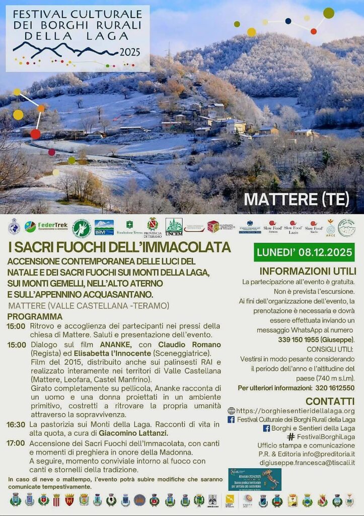 Lunedì 8 dicembre, la comunità di Mattere (TE) accoglierà visitatori e appassionati per celebrare l’accensione contemporanea delle luci natalizie e dei fuochi rituali sui Monti della Laga, sui Monti Gemelli, nell’Alto Aterno e sull’Appennino Acquasantano. Una pratica carica di simbolismo, che rinnova un legame profondo con il territorio e con le sue radici culturali.