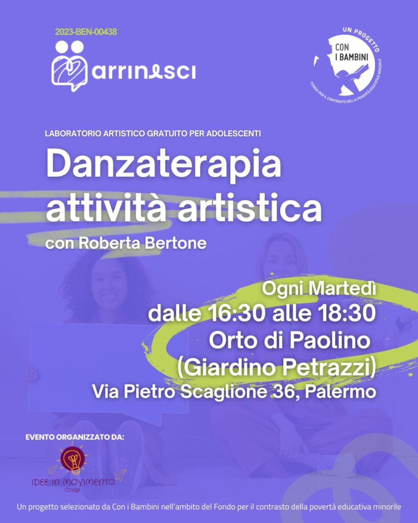 PALERMO. La cooperativa Idee in Movimento, partner operativo del progetto ARRINESCI – iniziativa co-finanziata da Con i Bambini nell’ambito del Fondo per il contrasto della povertà educativa minorile – annuncia l’apertura delle iscrizioni ai nuovi laboratori gratuiti destinati agli adolescenti tra gli 11 e i 18 anni. Le attività, che prenderanno avvio a gennaio 2026 presso L’Orto di Paolino (Giardino dei Petrazzi) in via Pietro Scaglione 36 a Palermo, si inseriscono in un più ampio percorso rivolto alla promozione del benessere psicologico, emotivo e relazionale dei giovani del territorio. Sebbene la sede di riferimento ricada nella Sesta Circoscrizione, le iniziative sono aperte a ragazze e ragazzi provenienti da tutta la città.