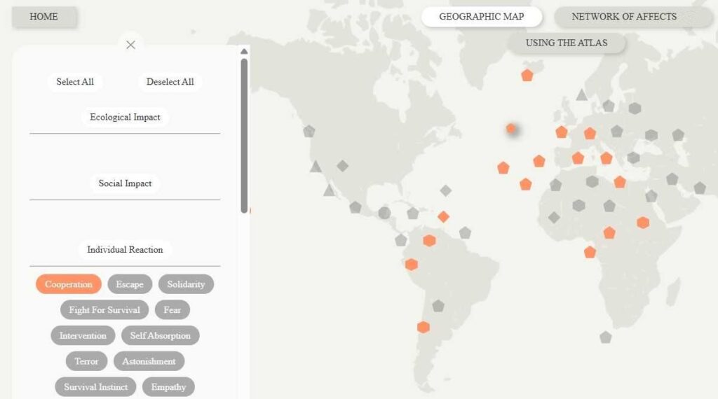 : uno spazio visivo e relazionale che traduce in forma digitale il percorso di ricerca. In questo contesto, le opere letterarie non sono semplici testimonianze, ma diventano laboratori di emozione e pensiero, luoghi in cui individui e comunità elaborano la paura, la perdita e i processi di ricostruzione. Ogni nodo dell’atlante mette in relazione eventi reali come terremoti, eruzioni e luoghi del disastro con simboli e metafore culturali, conseguenze storiche e sociali e i diversi linguaggi filosofici e poetici che raccontano il rischio, il trauma e la rinascita. Ne emerge un ecosistema narrativo che rende accessibile e condivisibile la complessità delle risposte umane ai fenomeni estremi.