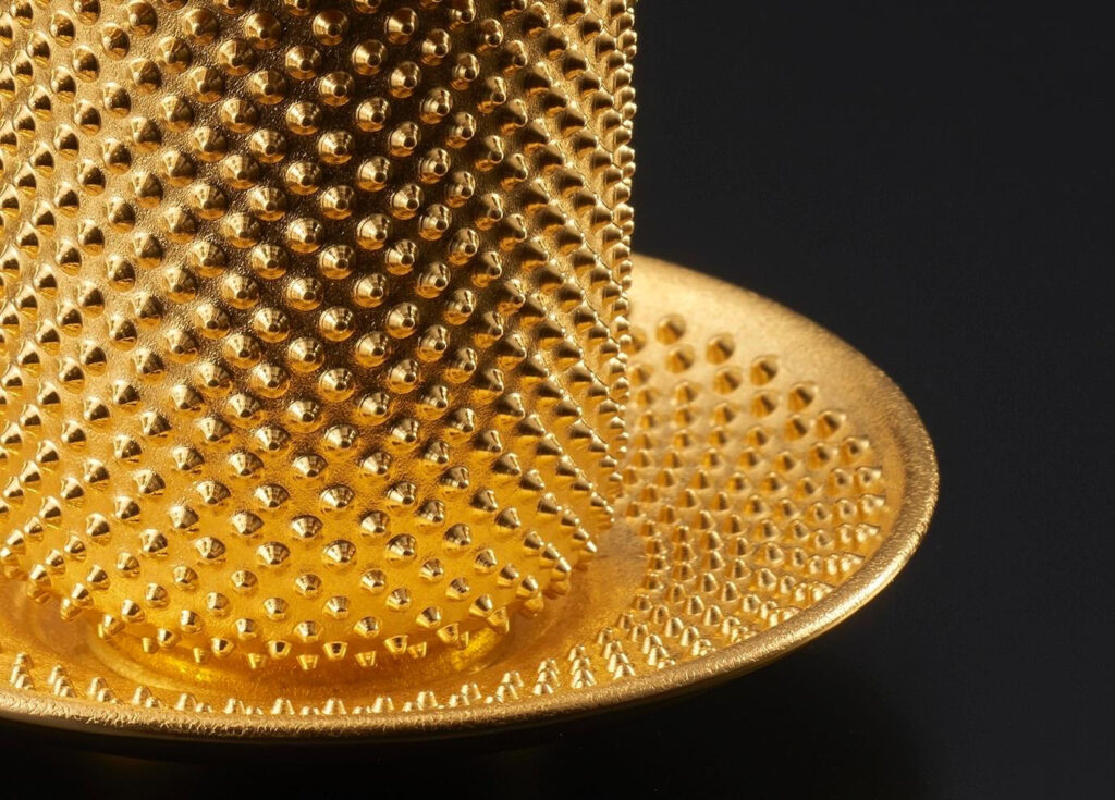 La metallurgia giapponese è una tradizione antica in cui oro, argento, rame e ferro vengono lavorati, fusi in leghe speciali, martellati, incisi o incrostati per creare forme e decorazioni. Introdotta nel periodo Yayoi (300 a.C. – 250 d. C. circa), si è sviluppata nei secoli per produrre utensili per i rituali buddhisti, accessori per le spade dei samurai, utensili per il tè e oggetti d’uso quotidiano, gioielli. Con l’introduzione dalla Cina del Buddhismo nel VI secolo, questa arte progredì rapidamente: nel periodo Nara (710 – 794 d. C.) fiorì la tecnica di doratura, mentre le tecniche di lavorazione con foglia e fili d’oro si perfezionarono nel periodo Heian. Tra i periodi Muromachi (1392-1568), Momoyama (1573-1868) ed Edo (1600-1868), i maestri affinarono incisione e intarsio, definendo un’estetica tipicamente giapponese. Oggi, l’oro e gli altri metalli continuano a essere impiegati in oggetti rituali, arti decorative, gioielleria e restauro. Fusione, martellatura e incisione restano tecniche fondamentali che conferiscono alle opere ricchezza espressiva e profondità e sono realizzate da maestri artigiani cui viene conferito il titolo di “Tesoro Nazionale Vivente”, ufficialmente riconosciuti come detentori del sapere immateriale fatto di tecniche tradizionali di altissimo valore storico e artistico che – tramandate – hanno plasmato la cultura giapponese. Queste comprendono l’artigianato – ceramica, lacca, metallurgia, carta washi, legno, bambole – ma anche le arti performative come il teatro Nō, il Kabuki, il bunraku e il saper fare legato alla vita quotidiana, tra cui la cucina e il sake.