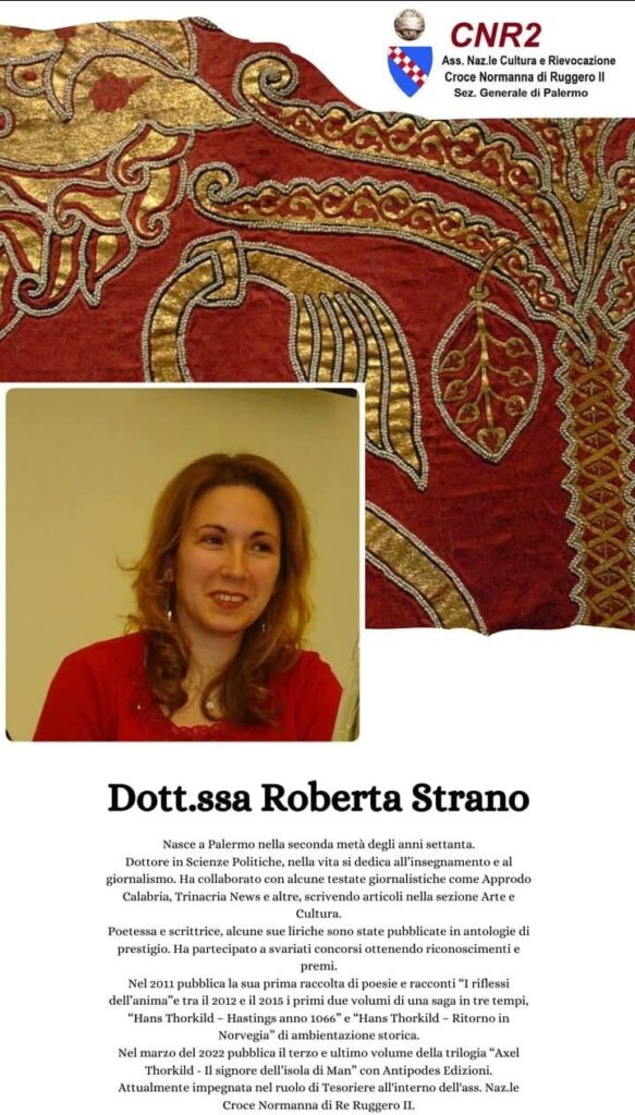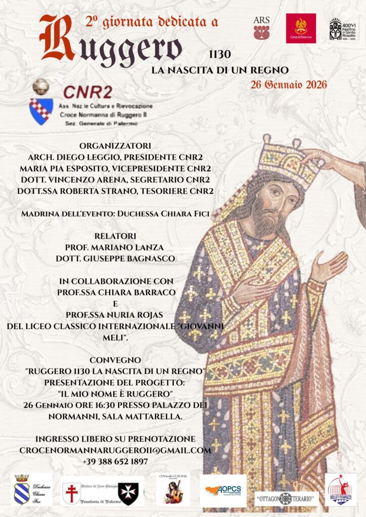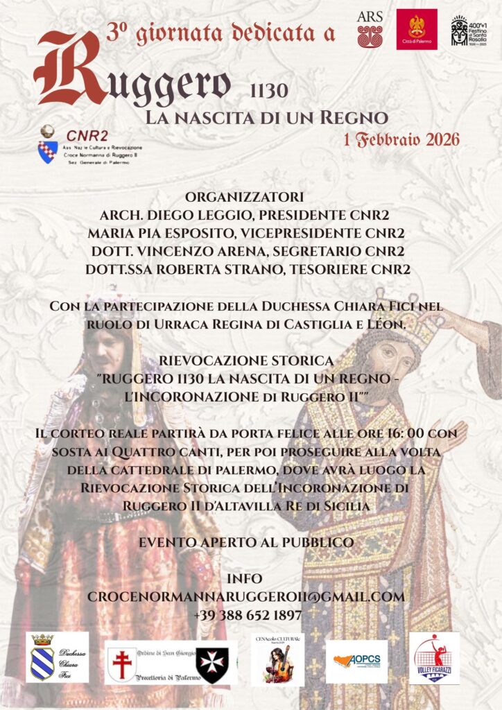 Palermo riscopre il suo ruolo di capitale del Mediterraneo medievale con Ruggero 1130 – La nascita di un Regno, il progetto culturale promosso dall’Associazione Nazionale Cultura e Rievocazione Croce Normanna di Ruggero II (CNR2), presieduta dall’architetto Diego Leggio, che intreccia divulgazione storica, ricerca e rievocazione scenica, insieme al suo direttivo: Maria Pia Esposito vicepresidente, Vincenzo Arena segretario e Roberta Strano tesoriere. Madrina dell’iniziativa è la duchessa Chiara Fici.