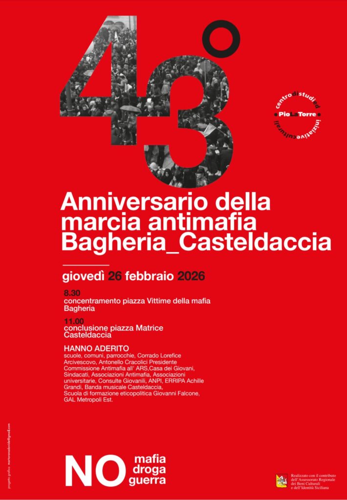 La partenza del corteo sarà alle ore 9 in piazza ‘Vittime della mafia’ a Bagheria per concludersi circa alle 11 a piazza Matrice, a Casteldaccia.