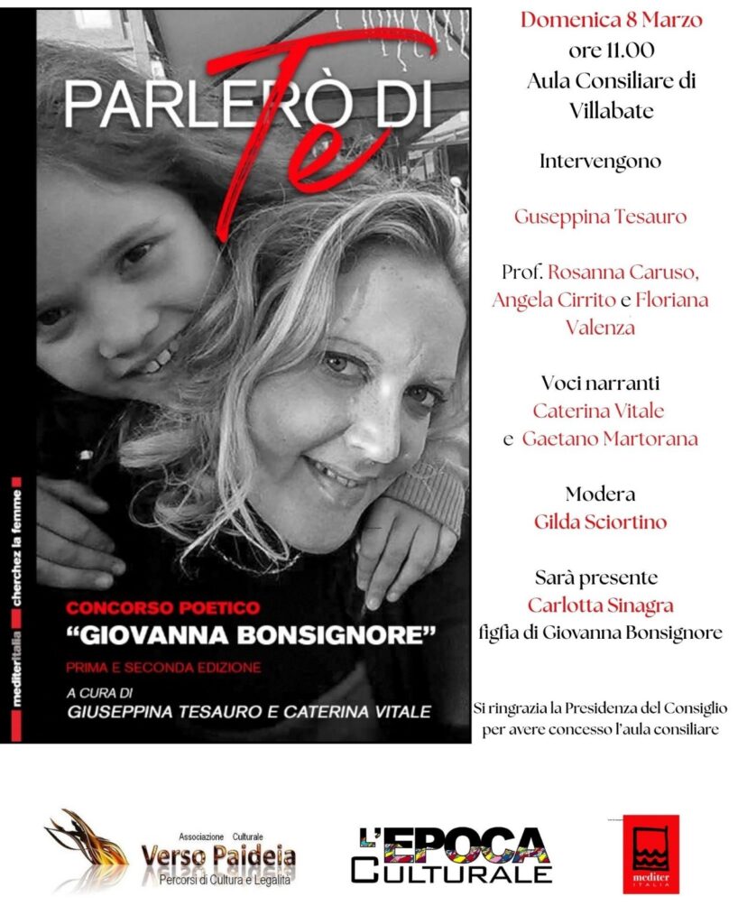Parole significative che rendono ancora più forte “Parlerò di te”, libro edito da Mediter Italia nella collana “Cherchez La Femme”, che raccoglie le poesie della prima e seconda edizione del Concorso di poesia “Giovanna Bonsignore”, ideato e promosso dall’associazione “Verso Paideia – Percorsi di Cultura e Legalità”, presieduta da Caterina Vitale, con la partecipazione dell’Istituto Secondario di Primo Grado “Pietro Palumbo” di Villabate.