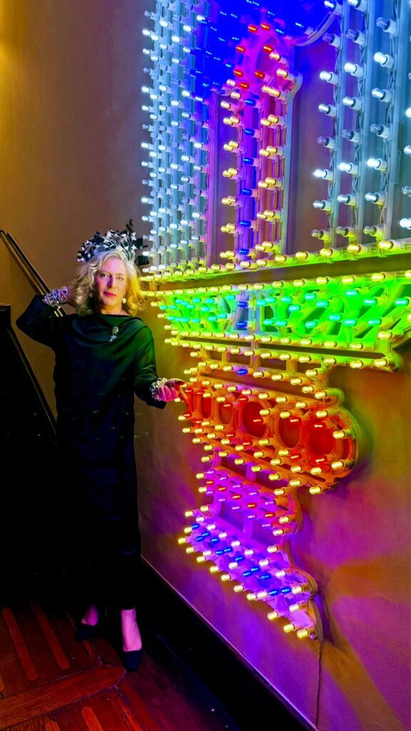 Una luminaria contemporanea raffigurante una fontana accoglieva gli ospiti all’ingresso, quasi un segnale festivo e insieme concettuale, in dialogo con la tradizione popolare del Sud. Il ricevimento si è svolto nel Salone Florio e nella stanza attigua, dove erano esposte tre opere, tra cui la Marilyn della locandina, filtrata da colori acidi e attraversata dalla scritta We are all whatever singularities, e una scultura che rimanda al paesaggio archeologico di Selinunte e alla memoria di Sebastiano Tusa.