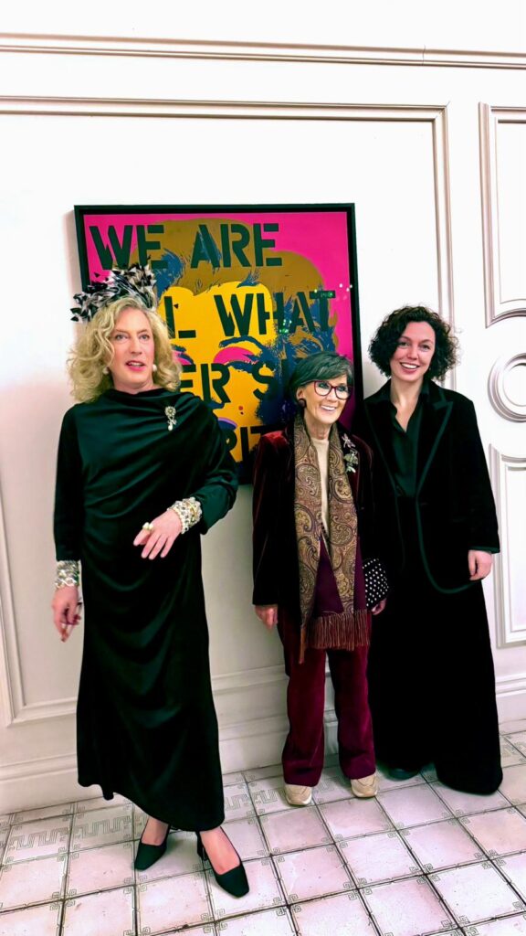 Per l’occasione ho indossato un tubino nero in velluto asimmetrico esistenzialista alla Juliette Greco, con broche in brillanti e perla, grandi perle ai lobi e in testa, un dissacrante l’esistenzialismo, civettuolo tralcio di piume bianco e nero, perché la leggerezza è il modo migliore per immergersi nell’arte.