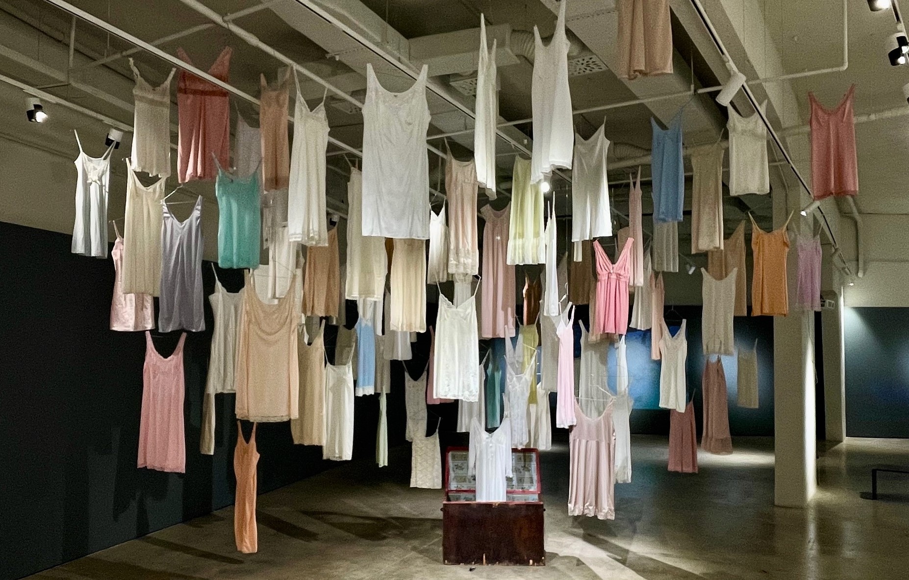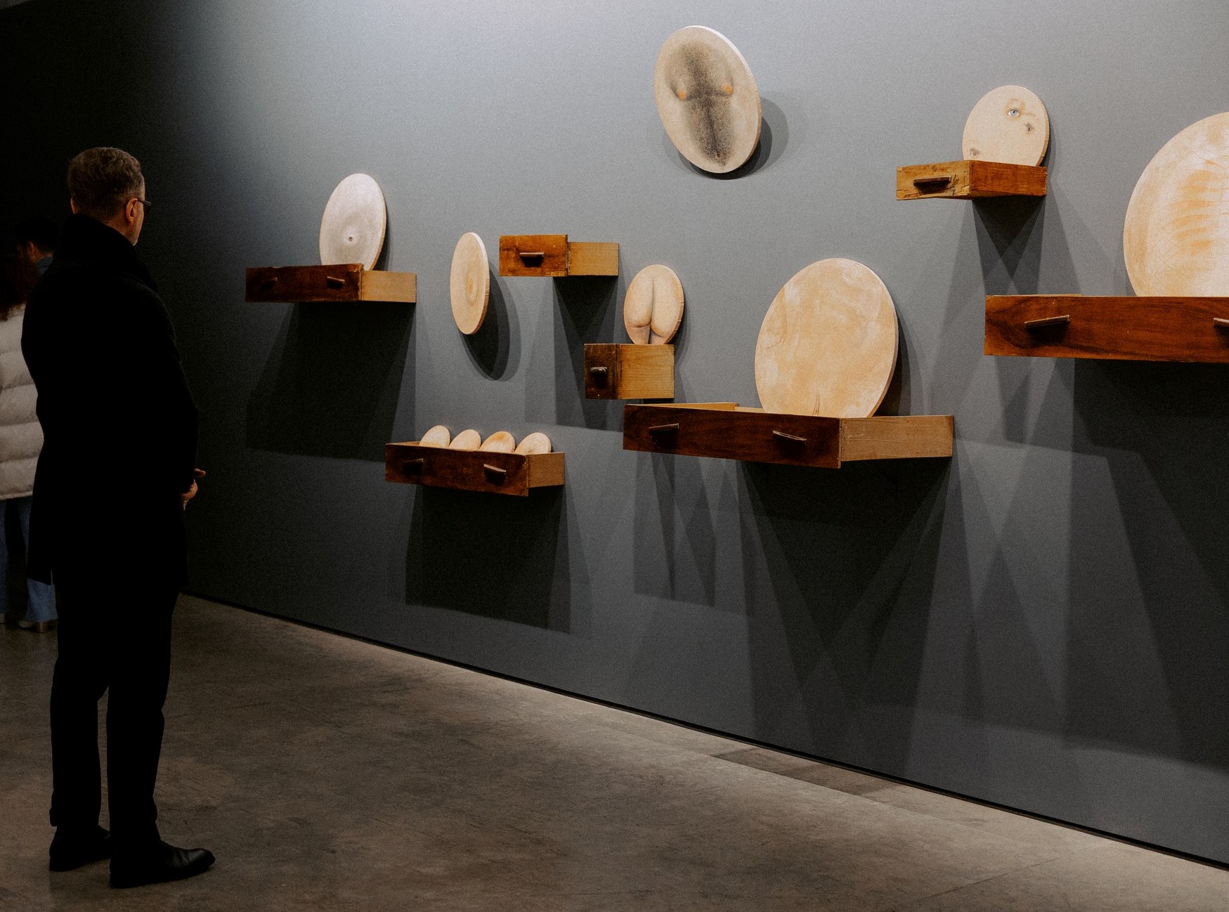 Il luogo dell’allestimento non ha alcun richiamo né a forme classiche né alla sontuosa architettura dei palazzi signorili della Mitteleuropa. Non è un interno borghese né richiama in alcun modo la natura romanticamente intesa. Sulle pareti corrono ordinate sia le tubature dell’impianto elettrico che i condotti dell’aerazione; dai binari alcuni faretti tagliano con luci gelide il buio ostinato dello spazio. Dove siamo? È un luogo della mente, lontano da ogni riferimento sociale: un luogo anaffettivo, ordinato, disadorno; in poche parole inumano.