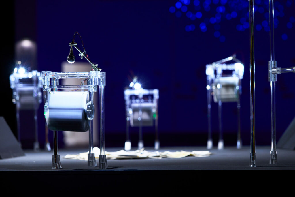 Nei suoi disegni cinetici automatizzati, Anna Frants esplora il rapporto in costante evoluzione tra luce e tempo, riaccendendo l’eterno desiderio dell’essere umano di catturare il movimento attraverso la luce – dalle pitture rupestri preistoriche all’animazione digitale contemporanea. L’installazione di Jaanika Peerna evoca la fluidità e la memoria atmosferica dei ghiacciai. Il suo titolo enuncia uno struggente paradosso: dobbiamo amare profondamente i ghiacciai, ma mantenere quell’amore abbastanza freddo in modo da prevenire la loro scomparsa.