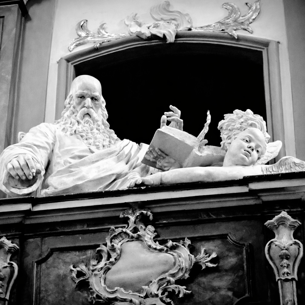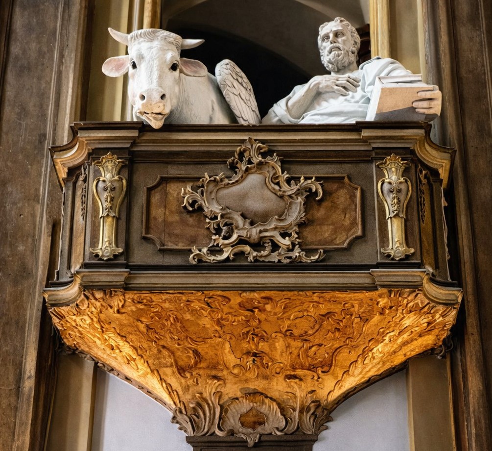 L’impianto degli Evangelisti nei matronei non assolve ad una funzione liturgica ma contribuisce a dare corpo e significato all’architettura sacra: il tempio si arricchisce dei testimoni dell’incarnazione, venti secoli di storia si comprimono in un soffio di tempo, in un battito di ciglia, nel puro istante della percezione. Lo scorrere dei secoli non sovrasta più il fedele, non incombe né cancella la memoria; il tempo smette di essere naturale, fisiologico, ordinario. Il presente diventa la dimensione eterna, il compimento cosmogonico della rivelazione che è raccolta in un gioco di luci e di ombre da uno scultore di grande talento e da una bravissima fotografa delle emozioni.