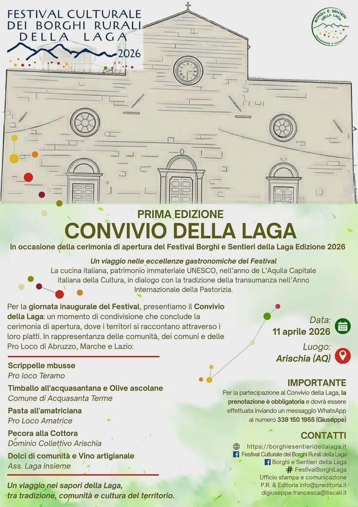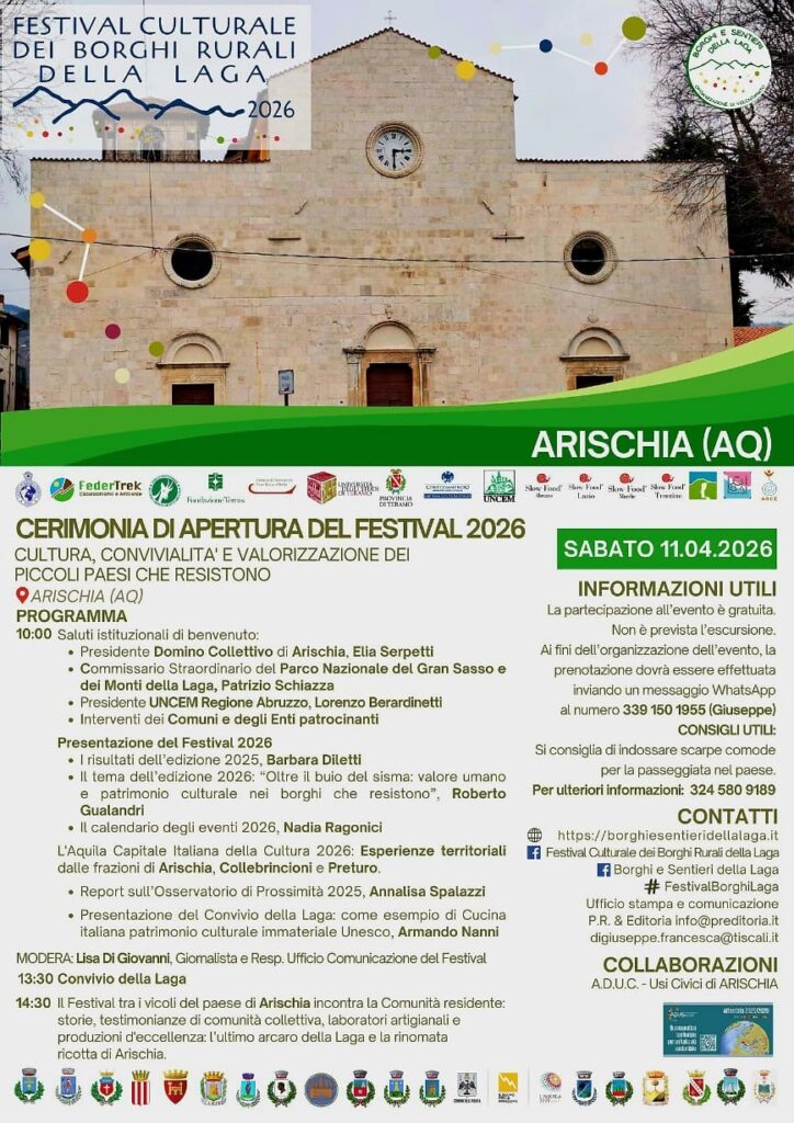 Anticipata dalla conferenza stampa nazionale di presentazione in modalità “online” di mercoledì 8 aprile, dove è prevista la partecipazione di rappresentanti dell’organizzazione, dei partner e dei numerosi soggetti istituzionali patrocinanti, la quinta edizione del Festival diffuso la cui durata non ha paragoni in Europa si prepara, in coincidenza del riconoscimento alla città de L’Aquila e al suo territorio come “Capitale Italina della Cultura 2026”, all’attesa cerimonia di apertura fissata per sabato 11 aprile proprio nella frazione di Arischia, ospitata presso l’accogliente sede dell’Amministrazione dei Beni Separati (ADUC) di Piazza Duomo.