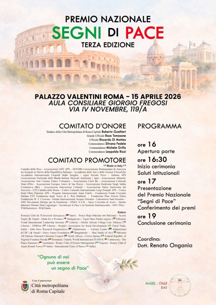 Nella capitale si rinnova uno degli appuntamenti più significativi dedicati ai valori della convivenza e del dialogo. Il prossimo 15 aprile, nella prestigiosa cornice di Palazzo Valentini, andrà in scena la terza edizione del Premio Nazionale ‘Segni di Pace’, promosso dalla Cattedra della Pace.
