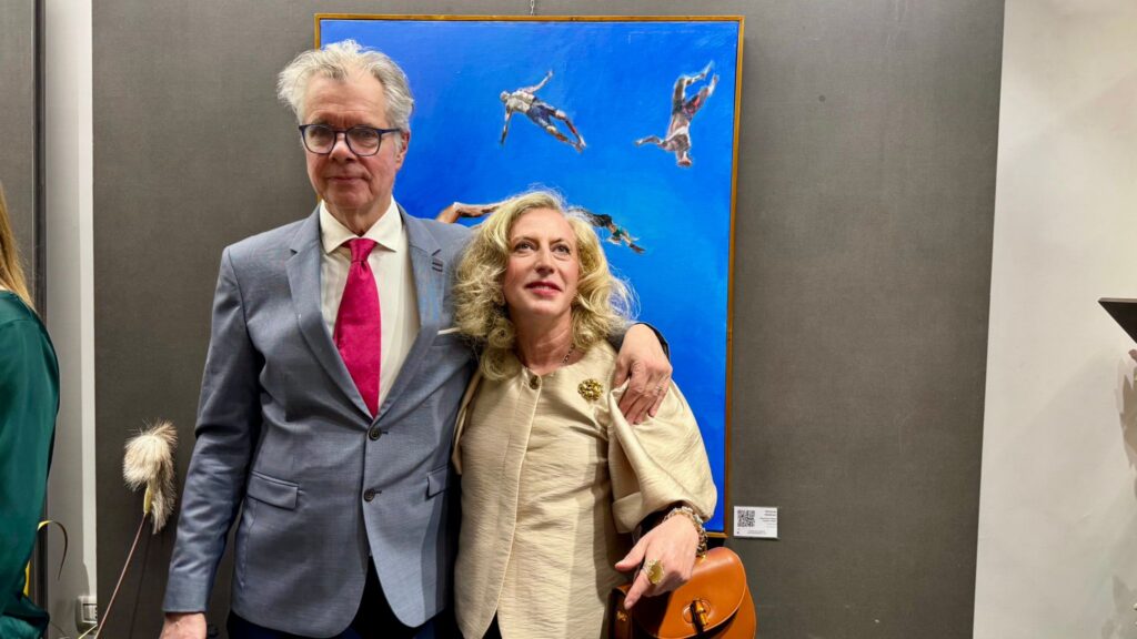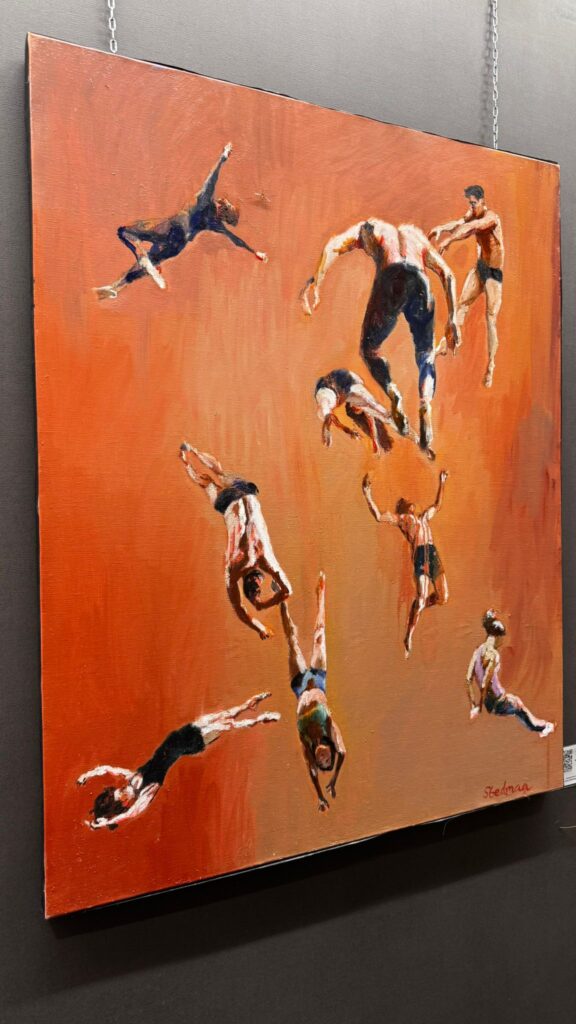 Cuore della serata è stata naturalmente la presentazione da parte di Tanino Bonifacio dell’opera di Stedman, interpretata come una “terra di mezzo”: uno spazio sospeso che richiama, per certi aspetti, suggestioni van goghiane, ma che si distingue per una cifra espressiva autonoma. Nei suoi lavori, i volti perdono nitidezza per lasciare spazio a corpi che si fanno linguaggio, presenze che comunicano attraverso una dimensione emotiva e quasi onirica. Una sospensione in cui, simbolicamente, tutti sembrano poter trovare posto.