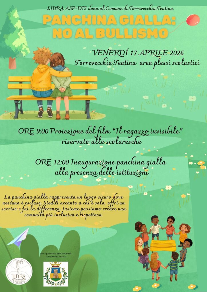 Venerdì 17 aprile dalle ore 9:00 Torrevecchia Teatina insieme alle scuole della cittadina teatina vivrà un momento sociale di grande impatto insieme all’APS-ETS LIBRA: la consegna all’amministrazione comunale della panchina gialla contro il bullismo e il cyberbullismo.