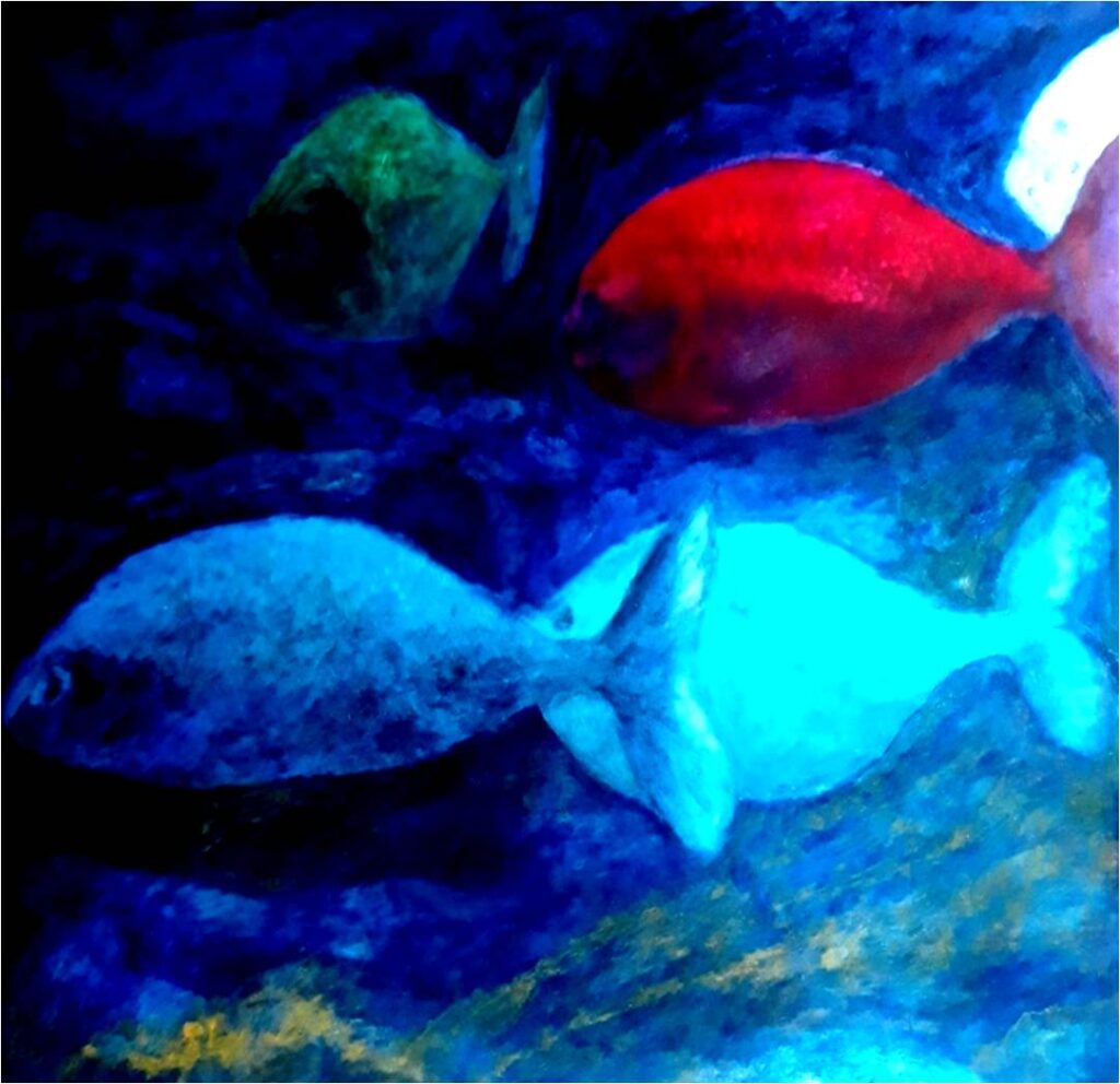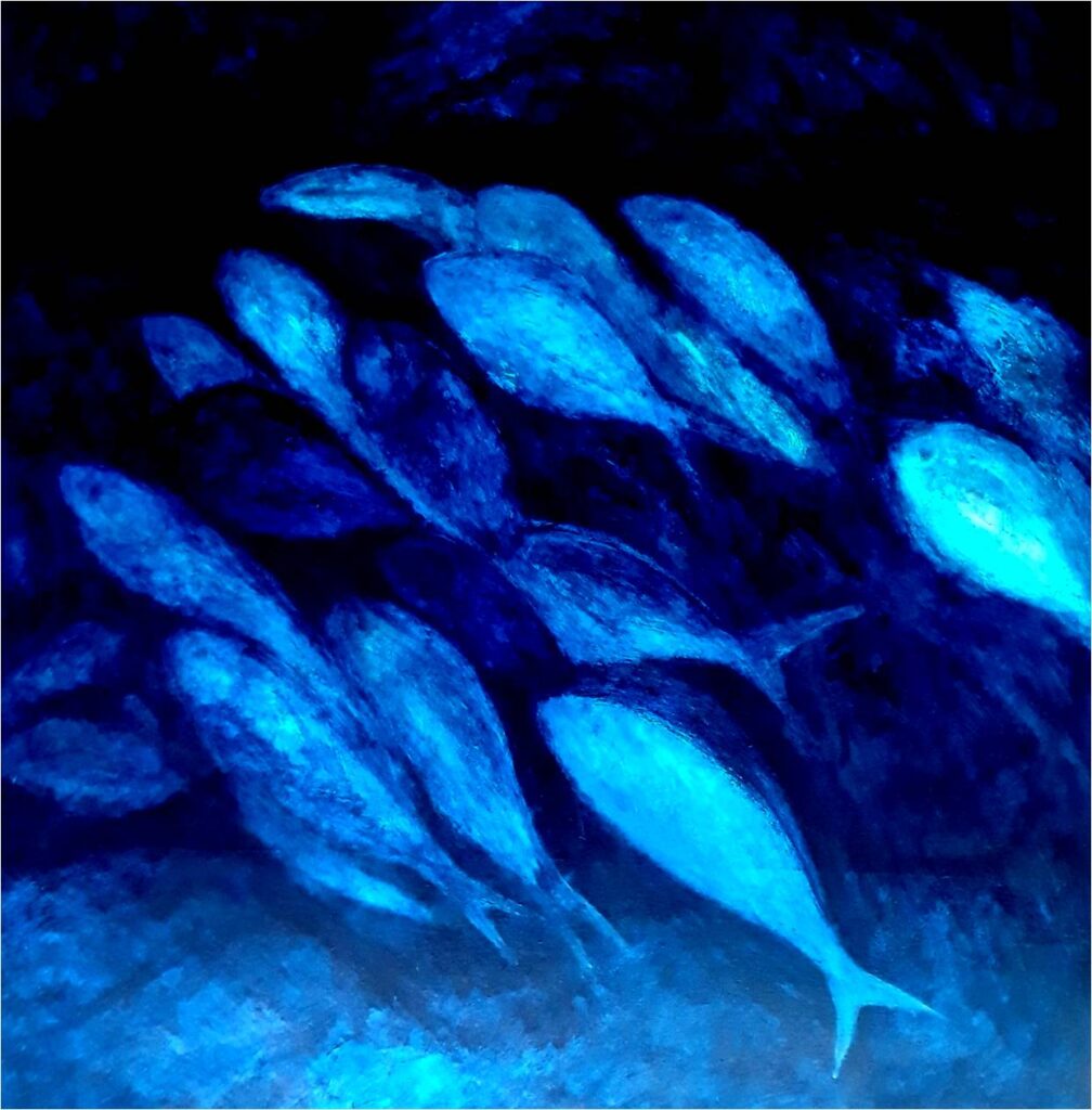 l’artista, in questo modo, prosegue il proficuo e coinvolgente dialogo con la cittadina normanna su tematiche marine, dopo le tre esposizioni “Meraviglie del mare” (Settembre 2021) e “Un mare di plastica” (aprile 2023) e “Profondo Blu” (agosto 2024) Il mare, dunque, e i suoi abissi. Silenzio, pace, mistero: così il blu delle profondità marine avvolge tutte le creature dell’acqua, facendone esplodere i colori. Allo stesso modo, il blu profondo delle tele di Gaetano Barbarotto avvolgono le sue creature pittoriche, esaltandone forme e sfumature e, come in un gioco pirotecnico, fa sbocciare i coralli gialli, fucsia e rossi.